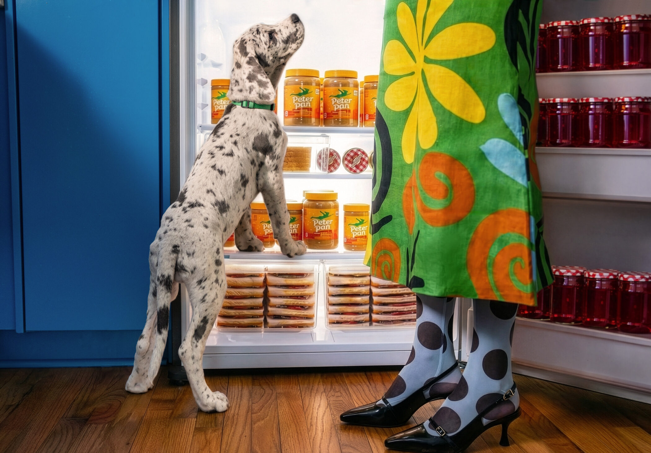 Photographer Genya O’Neall’s work truly mimics real life, especially when it comes to peanut butter, jelly, and some lovable canine friends. “Ever since I was little, I remember my dad digging into the peanut butter jar at night—usually “sharing” with the dogs. A swipe for him, a swipe for them. A time-honored tradition.”